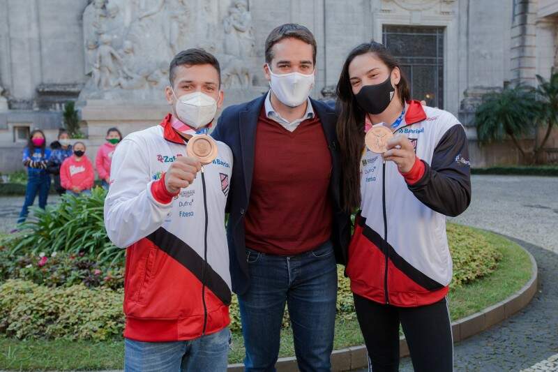 “Saibam que, quando vocês sobem ao pódio, sobe um monte de gente com vocês, pessoas que ajudam e as que torcem, ou seja, subimos todos nós. Parabéns, essa medalha é merecimento pelo esforço de vocês. Saibam que são exemplo e servem de inspiração para muita gente, especialmente jovens que ganham motivação a partir de vocês para praticar esporte e, quem sabe, também chegar às Olimpíadas um dia”, prosseguiu Leite.