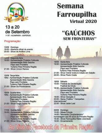 A Semana Farroupilha virtual será transmitida pelo Facebook da 1ª Região Tradicionalista e também pela página da Rádio Liberdade. O objetivo dos organizadores é manter o mesmo espírito da Semana Farroupilha que ocorreria no Parque Harmonia, se não fosse a pandemia do novo coronavírus.