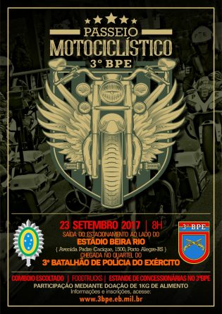 Neste sábado (23), militares e civis estarão unidos por motivações em comum: a solidariedade e a paixão por motociclismo. São esperadas cerca de 400 motos no 1º Passeio Motociclístico do 3º Batalhão de Polícia do Exército. A concentração acontecerá das 8h à 9h no estacionamento ao lado do Estádio Beira-Rio (Avenida Padre Cacique, 1500, Porto Alegre) e às 9h, haverá reunião e orientações para o grupo.