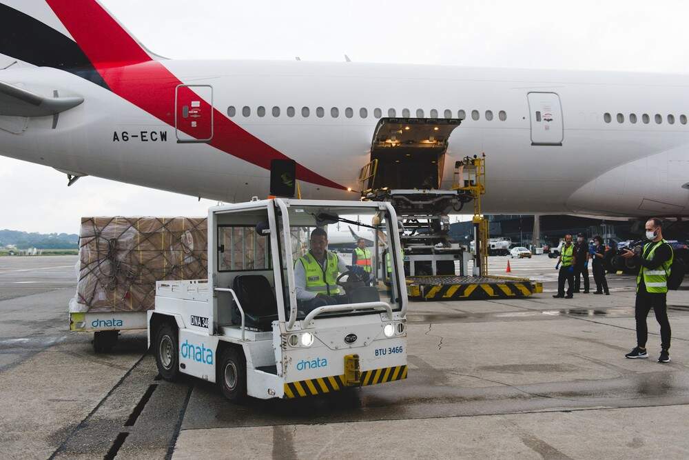 Os kits foram transportados em 417 caixas, somando 6,3 toneladas, e embarcados no Aeroporto Internacional de Guangzhou Baiyun, na província chinesa de Guangdong, na madrugada de domingo (29).