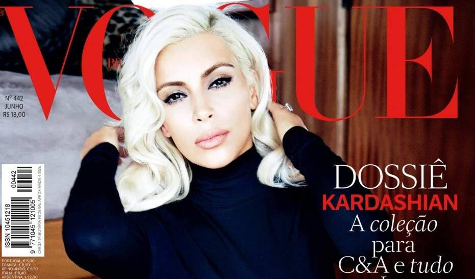 Destaque por onde passa por suas curvas acentuadas, a socialite Kim Kardashian desta vez chama atenção pelos cabelos loiros platinados exibidos na capa da edição deste mês da “Vogue Brasil”.