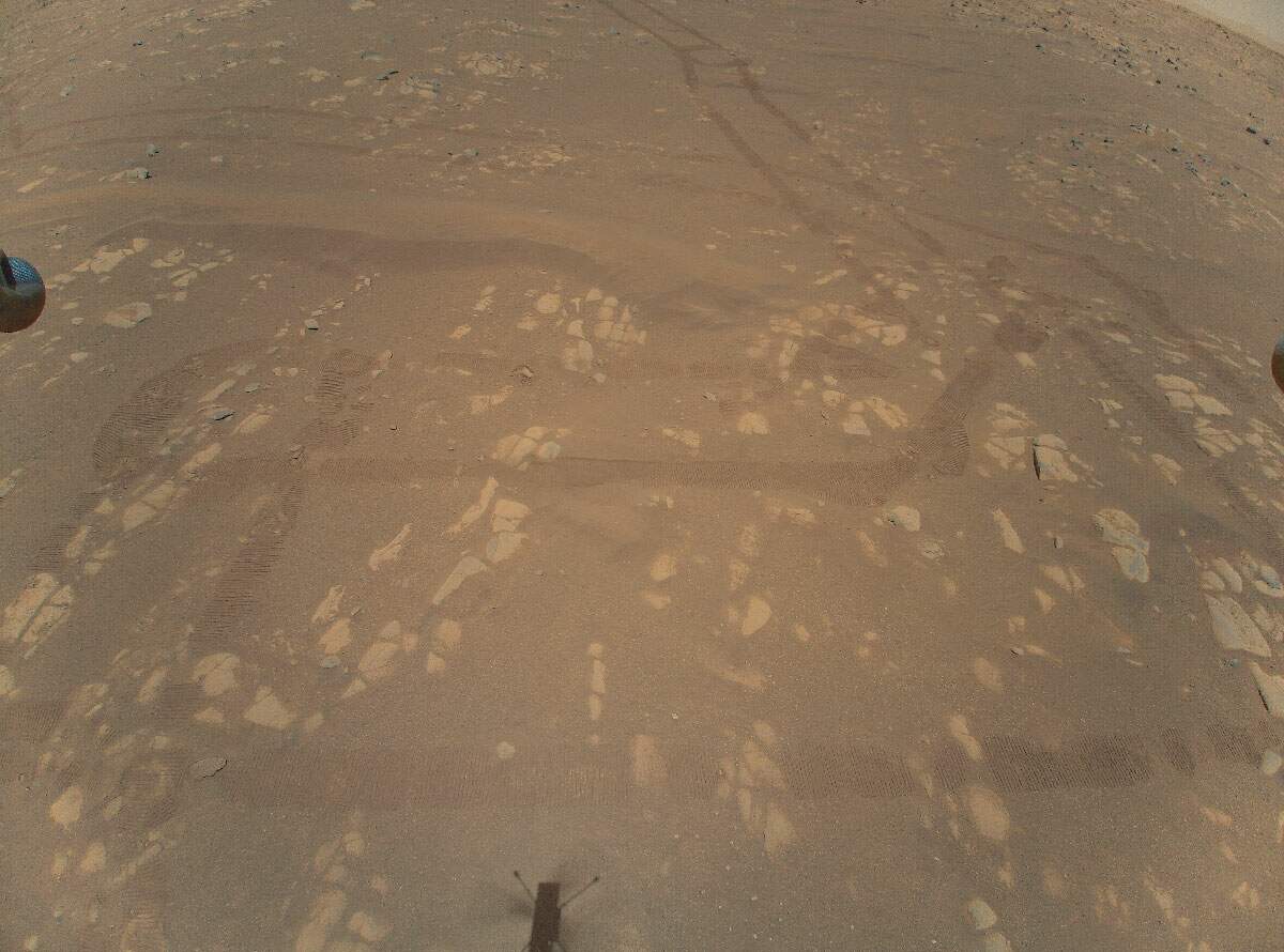 A imagem foi captada quando o Ingenuity estava a 5,2 metros acima da superfície. O campo de visão da câmera estava se movendo para cima, para que o mini-helicóptero pudesse se deslocar para oeste, se afastando do Rover.