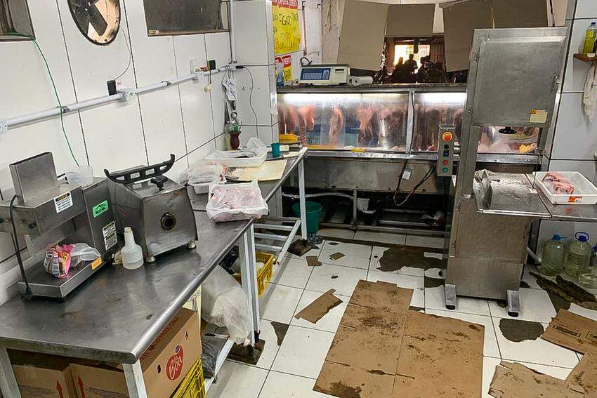 Não havia portas na área de produção da padaria e nem kit para higienização de mãos de manipuladores. Também foram localizados recortes de carne congelada destinados à indústria de alimentação animal, que eram moídos e comercializados como guisado. A equipe apreendeu mais de 263 quilos de alimentos.