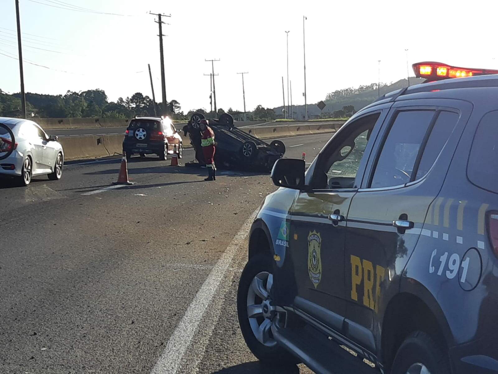 O acidente aconteceu por volta das 5h. A PRF ainda apura as circunstâncias do capotamento.