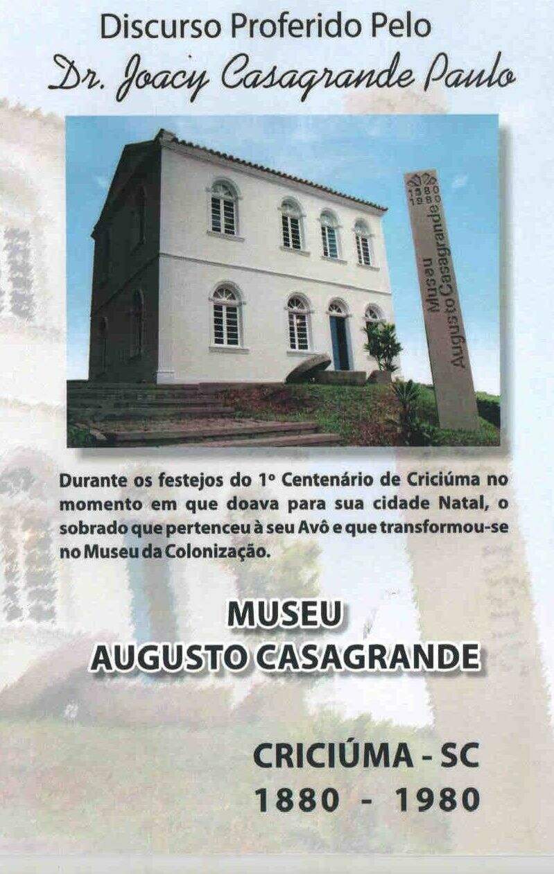 O médico Joacy Casagrande Paulo tem ativa participação nas realizações e festejos de Criciúma. Dedica especial atenção ao Museu Augusto Casagrande, instalado na antiga morada da família, e que doou para a instalação do Museu da Colonização.