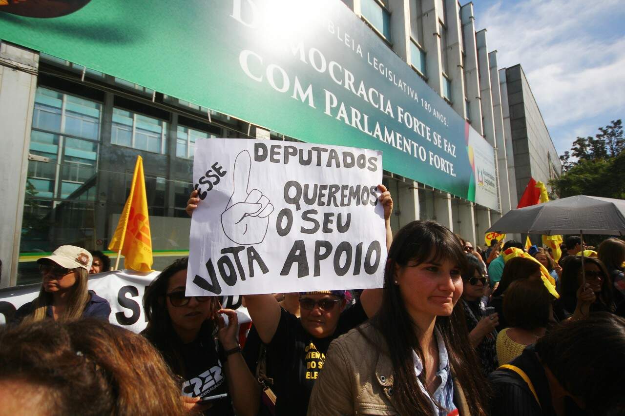 Porto Alegre, 15/09/2015 – Servidores públicos estaduais bloquearam acessos ao prédio da Assembléia Legislativa na manhã desta terça-feira e no momento em que o presidente Edson Brum tentava deixar o prédio foi impedido por alguns manifestante que iniciaram um empurra-empurra com seguranças. FOTO: LUCAS UEBEL