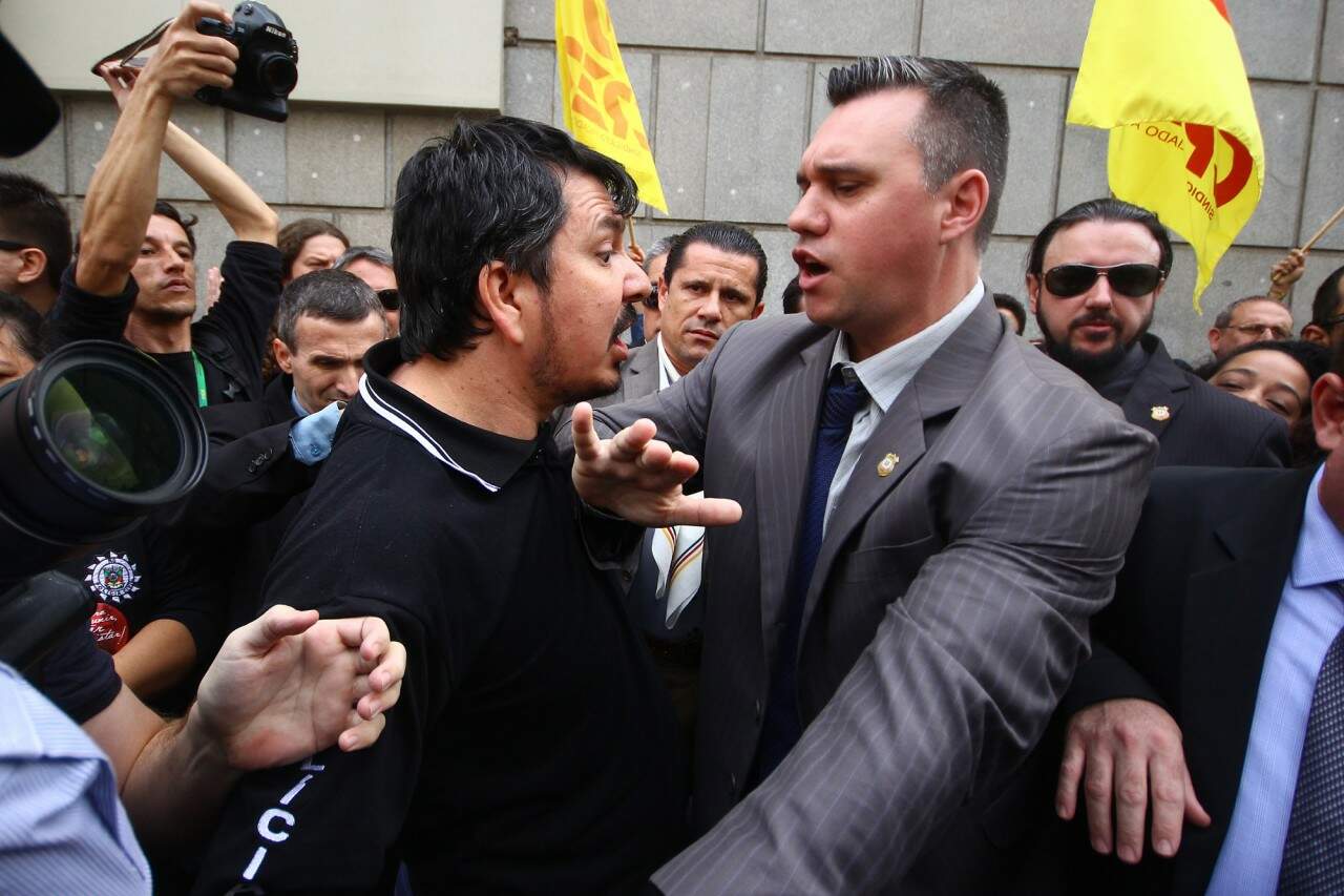 Porto Alegre, 15/09/2015 – Servidores públicos estaduais bloquearam acessos ao prédio da Assembléia Legislativa na manhã desta terça-feira e no momento em que o presidente Edson Brum tentava deixar o prédio foi impedido por alguns manifestante que iniciaram um empurra-empurra com seguranças. FOTO: LUCAS UEBEL