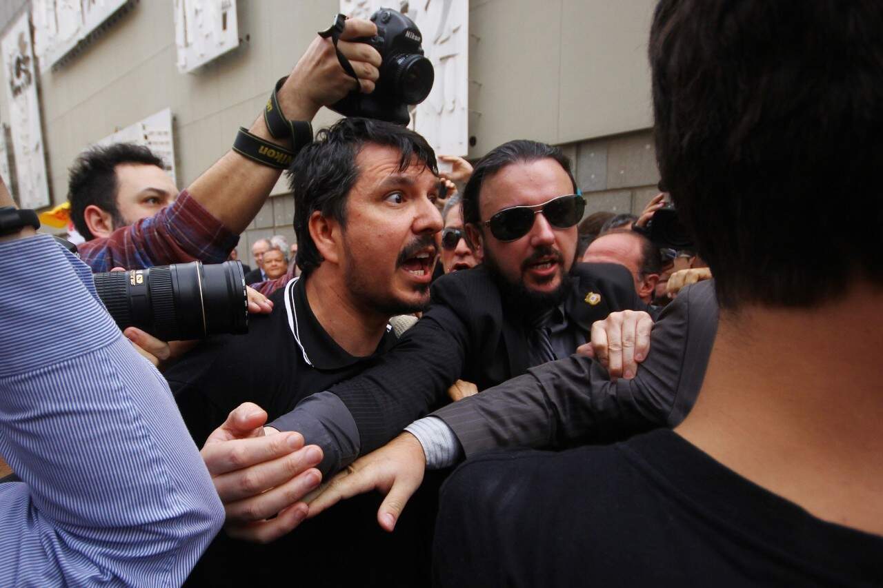 Porto Alegre, 15/09/2015 – Servidores públicos estaduais bloquearam acessos ao prédio da Assembléia Legislativa na manhã desta terça-feira e no momento em que o presidente Edson Brum tentava deixar o prédio foi impedido por alguns manifestante que iniciaram um empurra-empurra com seguranças. FOTO: LUCAS UEBEL