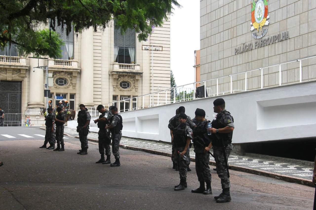 Porto Alegre, 28/12/2015 – Servidores públicos estaduais fazem vigia em frente à Assembleia Legislativa devido a possibilidade de votação de projetos polêmicos. A Brigada Militar reforçou a segurança no entorno do prédio com grande efetivo. FOTO: LUCAS UEBEL