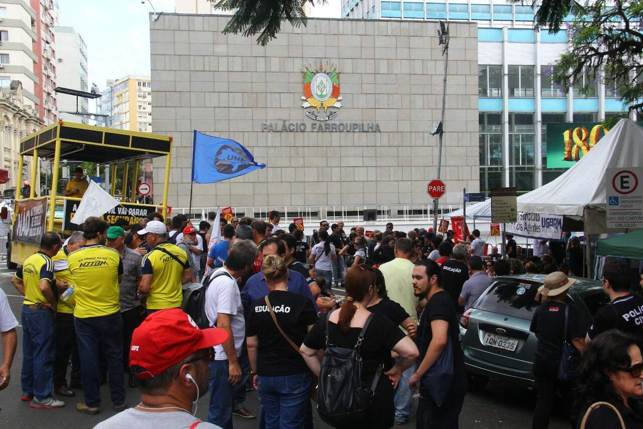 Porto Alegre, 28/12/2015 – Servidores públicos estaduais fazem vigia em frente à Assembleia Legislativa devido a possibilidade de votação de projetos polêmicos. A Brigada Militar reforçou a segurança no entorno do prédio com grande efetivo. FOTO: LUCAS UEBEL