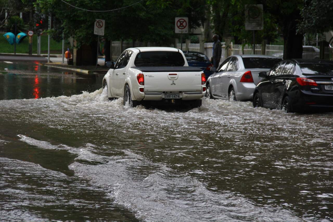 Porto Alegre, 11/10/2015 – As fortes chuvas que atigem o Rio Grande do Sul nos últimos dias causam transtornos em Porto Alegre. A rua Ismael Chaves Barcelos, entre as avenidas Praia de Belas e Borges de Medeiros, ficou completamente alagada. FOTO: LUCAS UEBEL