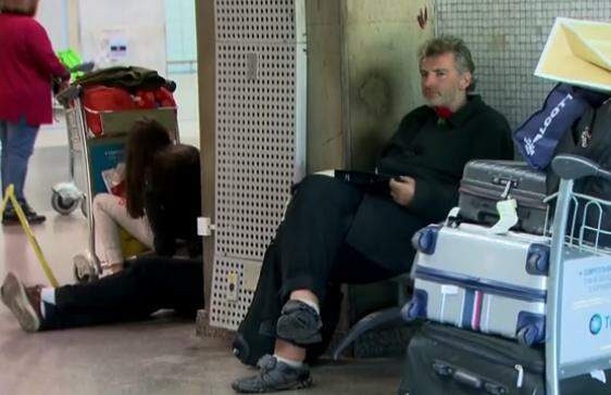 Em um dos vídeos do aeroporto é possível ver uma mulher de camisa preta mexendo tranquilamente no celular. De repente, o alemão levanta de uma cadeira, fica na frente dela e aparentemente bate na mulher. Depois, ele se senta como se nada tivesse acontecido. Sem entender o que está acontecendo, a passageira vai embora.