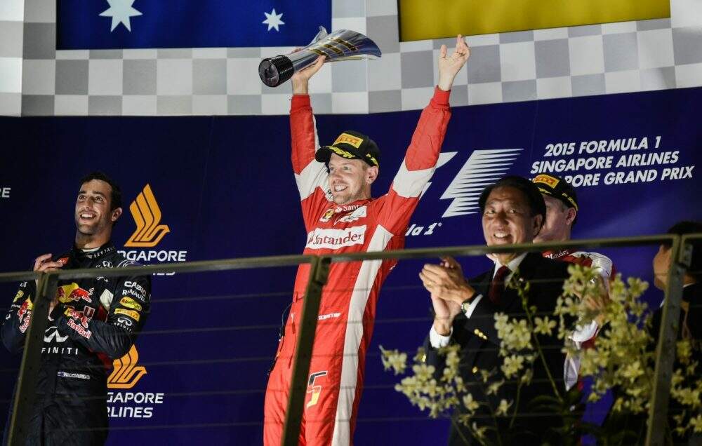 O australiano Daniel Ricciardo, da Red Bull, e o finlandês Kimi Raikkonen, companheiro de Vettel na Ferrari, completaram o pódio no circuito de Marina Bay na única prova noturna da categoria.