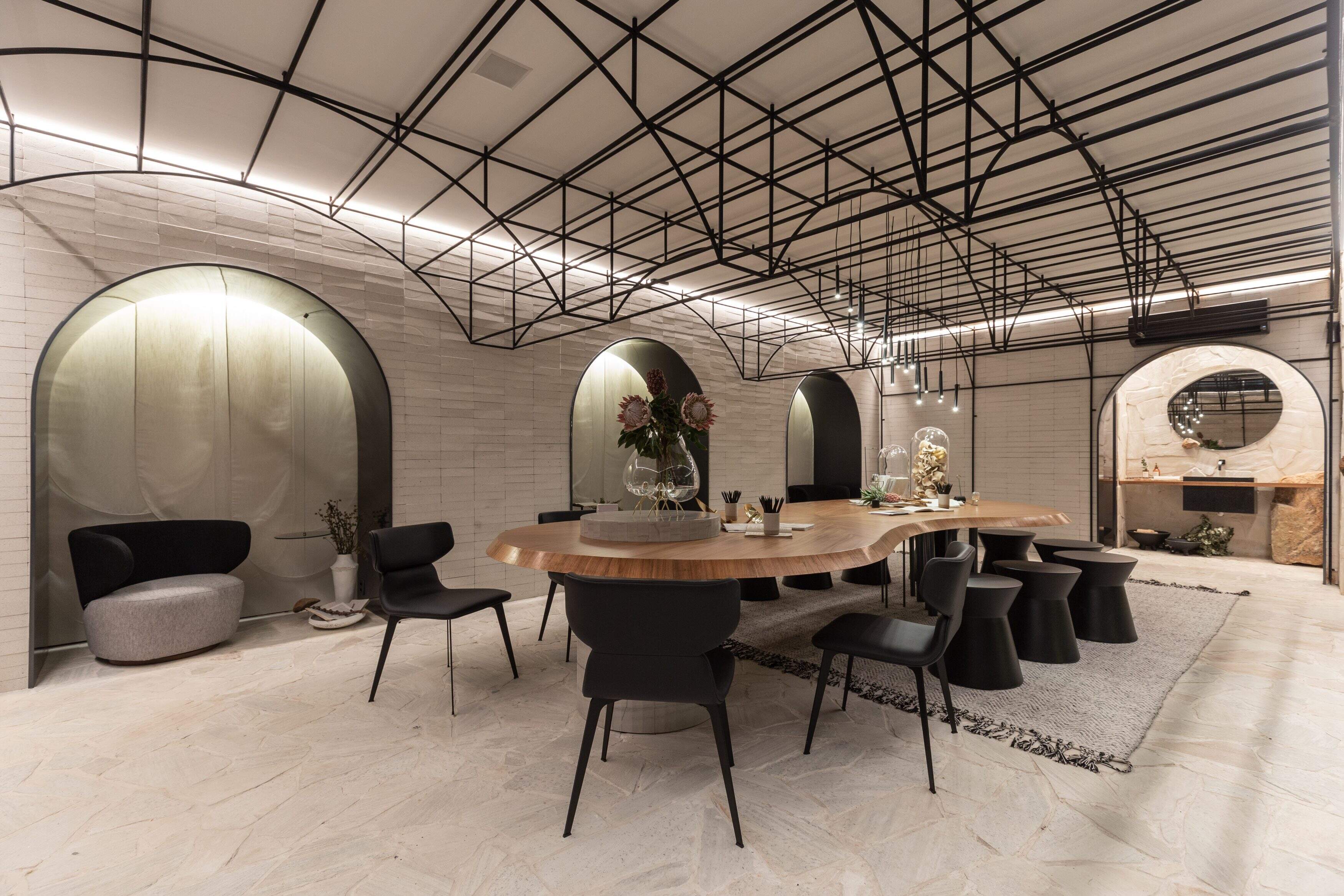 Já os escritórios de arquitetura Greisse Panazzolo e Studio Colnaghi assinam em conjunto o projeto do ambiente Aquam, que prioriza aspectos como naturalidade e leveza. “Em um espaço natural e convidativo, a leveza da pedra bruta flutua sobre a água, dando as boas-vindas ao visitante”, definem.