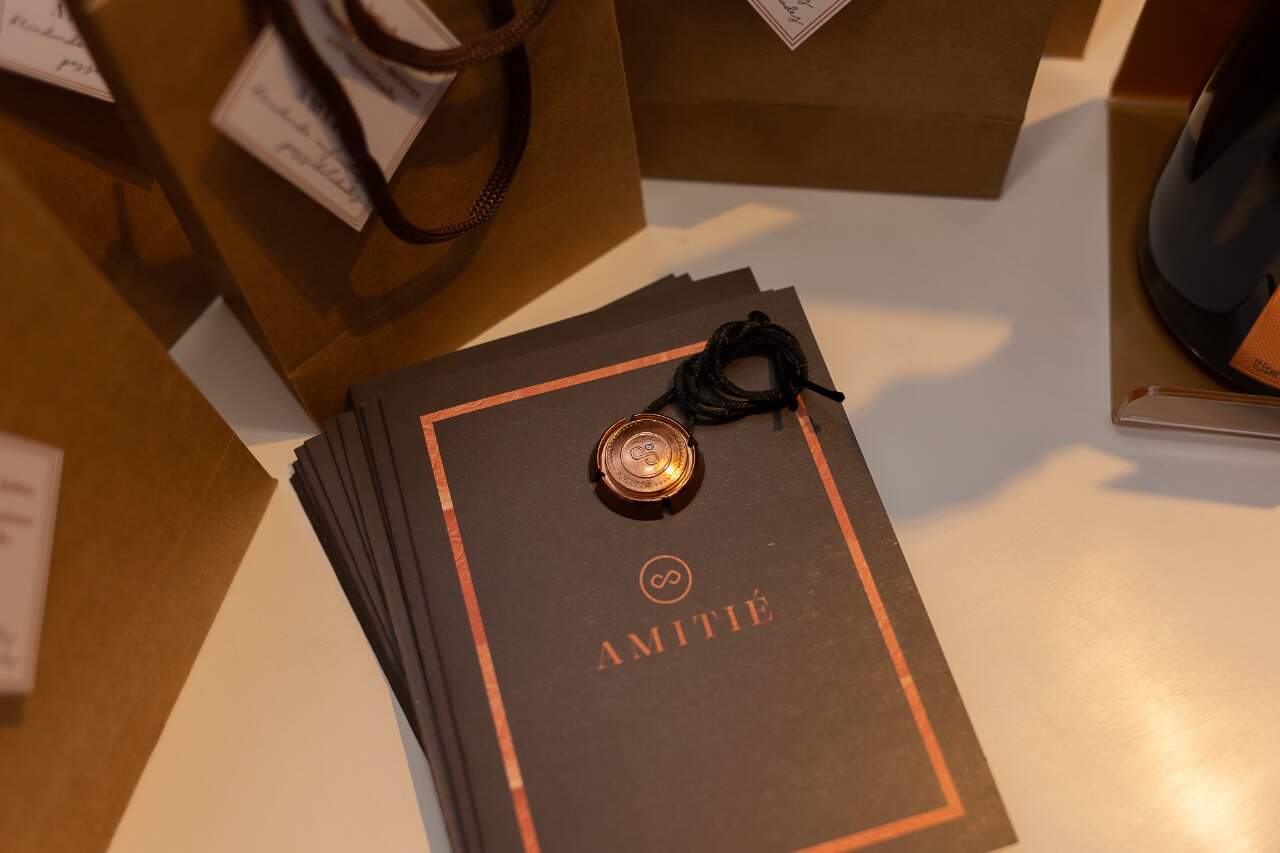 O termo joia é apropriado para este espumante, já que a tampa recebeu um cordão e um pingente de strass Swarowski simbolizando o infinito. “É uma joia única que representa a nossa amizade”, explica a sommelier Andrea Gentilini Milan, responsável pela criação da marca junto com Juciane Casagrande Doro.