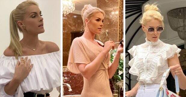 Entre os looks usados por Ana Hickmann na cidade, estão o clássico preto e branco, o dourado, e branco com blusa de babados.