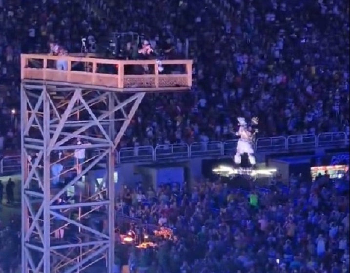 Homem “voando” em um drone na comissão de frente da Portela. (Foto: Reprodução)