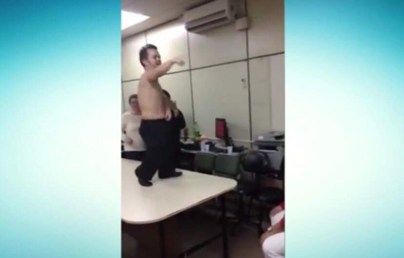 No vídeo ainda é possível ouvir música alta, muitas risadas e gritos de “aê, doutor”, o que indica que no local ocorria uma confraternização com pessoas bebendo cerveja e outras que estão ao fundo da sala, conversando, filmando e fotografando a situação com celulares.
