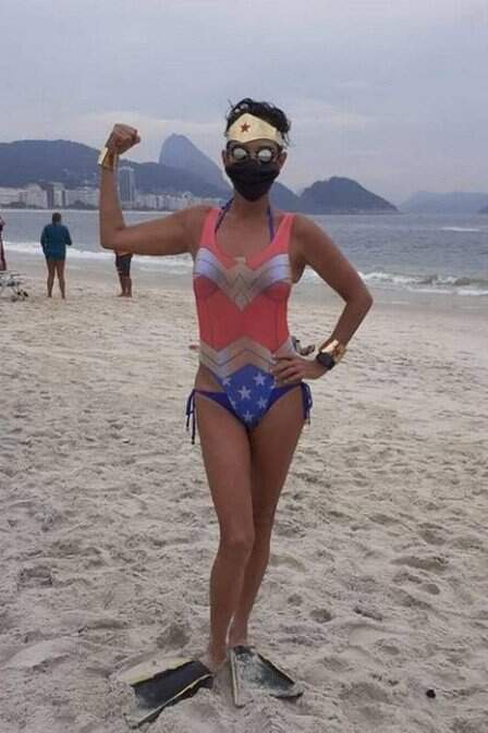 Ela faz o carnaval dela! Aos 57 anos, Andréa Beltrão foi à praia fantasiada. E posou linda de Mulher Maravilha mascarada e com pés de pato. Para quem não sabe, a atriz é adepta da natação há décadas, o que conferiu a ela equilíbrio e um corpo sequinho durante vários anos.