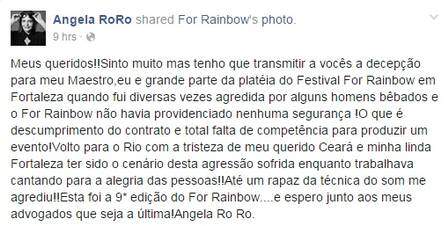 A cantora Angela Ro Ro encerrou antes do previsto o show que marcava a abertura do For Rainbow Festival de Cinema e Cultura da Diversidade Sexual e deixou sob vaias o palco do Centro Cultural Dragão do Mar, em Fortaleza.