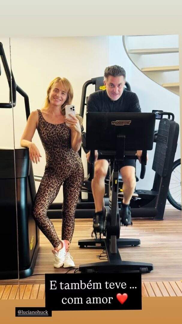 De body longo de oncinha e sem maquiagem, com os cabelos soltos, a apresentadora de 51 anos de idade posou na academia que tem em sua mansão no Rio, em pé ao lado do marido, de 54, que estava em uma bicicleta ergométrica.