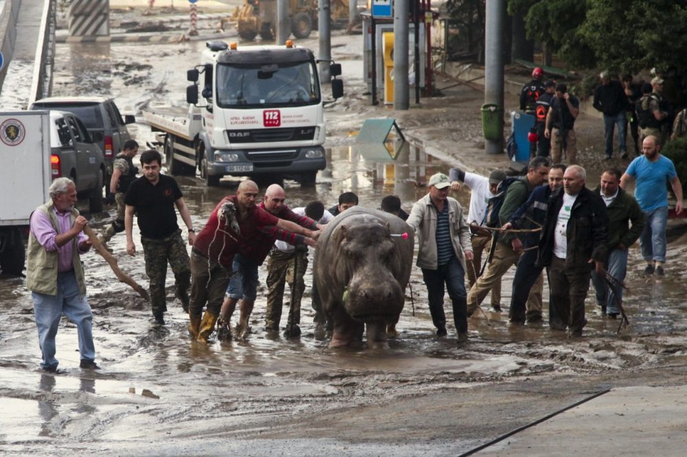Animais do zoológico de Tblisi, na Geórgia, na fronteira entre Europa e Ásia, passaram algumas horas passeando pelo Centro da capital da ex-república soviética depois que um temporal inundou as ruas da cidade nesse domingo. Ao menos 12 pessoas morreram nas inundações, 24 estão desaparecidas e 36 hospitalizadas. Um hipopótamo foi resgatado com a ajuda de dardos tranquilizadores e voluntários que o empurraram pelas ruas da cidade.