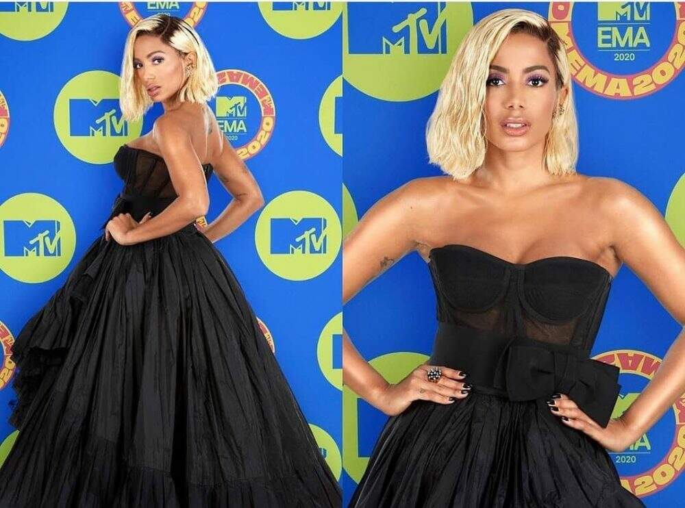 Anitta nem precisou sair de casa para causar neste domingo (8). Uma das apresentadoras e concorrentes do prêmio MTV Europe Music Awards 2020, a cantora gravou do Rio de Janeiro sua participação no evento, que aconteceu em Londres. Para a premiação, Anitta, que vem movimentando a web com um suposto romance com o rapper Xamã, escolheu um vestido tomara que caia da grife Dolce Gabbana. Nada básico, o modelo na cor preta mistura corte assimétrico, volume e transparência. Para completar o look a artista apostou em joias minimalistas da grife Sauer.