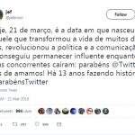 O Twitter, rede social utilizada por Bolsonaro frequentemente para dialogar e reagir à situações do cotidiano, tanto referentes à políticas quanto demais assuntos de seu interesse, também faz aniversário hoje. Em 21 de março de 2006, nascia a rede social que se mantém em uso há 13 anos.