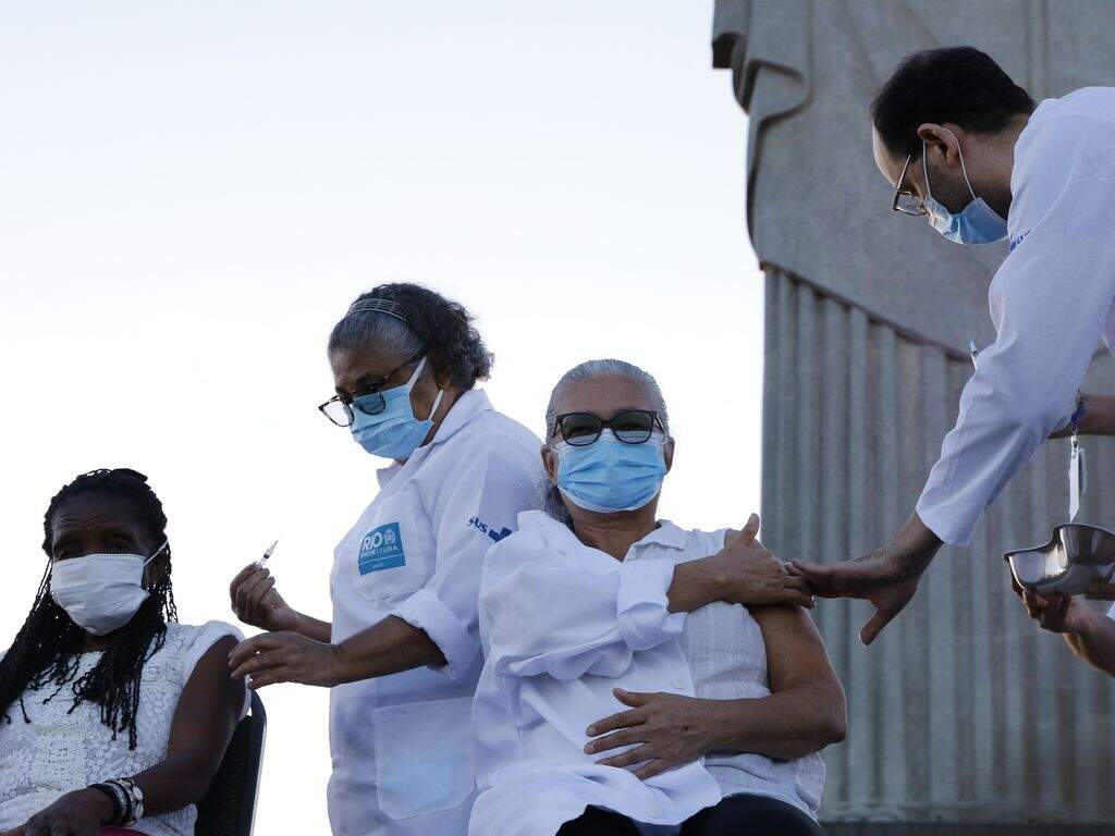 Rio de Janeiro: Dulcineia da Silva, de 59 anos, técnica de enfermagem no hospital Ronaldo Gazola, e Teresinha da Conceição, de 80 anos, acolhida pelos serviços da Prefeitura em 2015 depois de ter sua casa demolida pela Defesa Civil. Elas foram vacinadas no Cristo Redentor.