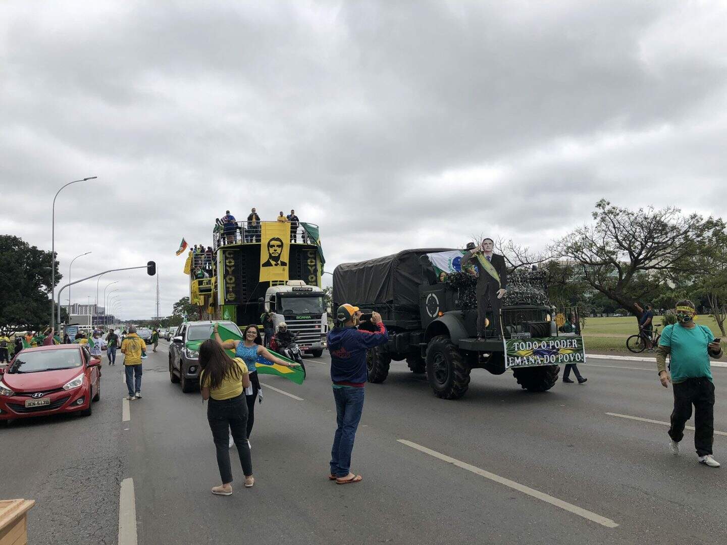 Manifestantes fizeram uma nova carreata em Brasília, na manhã do sábado (9), em apoio ao presidente Jair Bolsonaro (sem partido) e contra os presidentes da Câmara dos Deputados, Rodrigo Maia (DEM-RJ), e do Senado, Davi Alcolumbre (DEM-AP). O ato começou por volta das 11h e ocupou quatro faixas do Eixo Monumental. As vias foram liberadas às 14h40.
