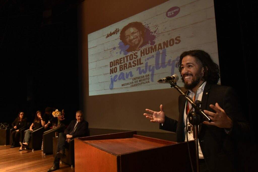 O deputado federal Jean Wyllys, do PSOL, recebeu nesta terça-feira (28) a Medalha do Mérito Farroupilha no Teatro Dante Barone na Assembleia Legislativa do Estado.