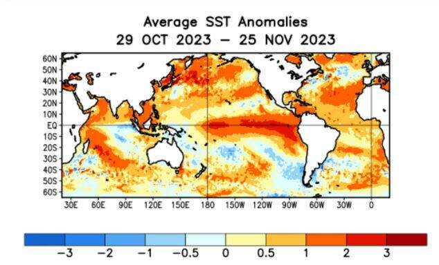 O relatório aponta que o Niño 3.4 registrou alta de 2,1°C. A região é a faixa do Pacífico Equatorial Centro-Leste usada como uma das principais referências para as análises e previsões relacionadas ao El Niño. No El Niño de 2015-2016, última vez que o fenômeno aconteceu de forma tão intensa, foi registrado um pico de 2,6°C de aquecimento.