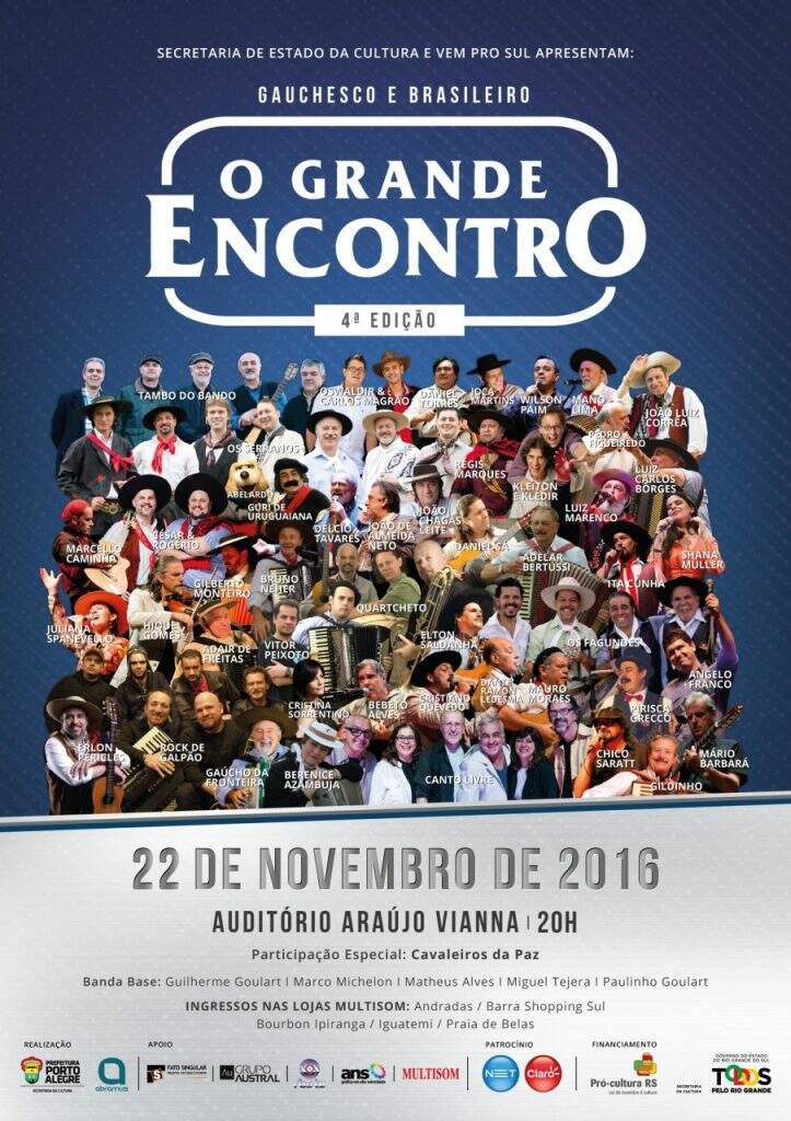 A quarta edição do Grande Encontro da música gaúcha será realizada no dia 22 de novembro, a partir das 20h, em Porto Alegre. Mais de 80 artistas se encontrarão no palco do auditório Araújo Vianna (avenida Osvaldo Aranha, 685).