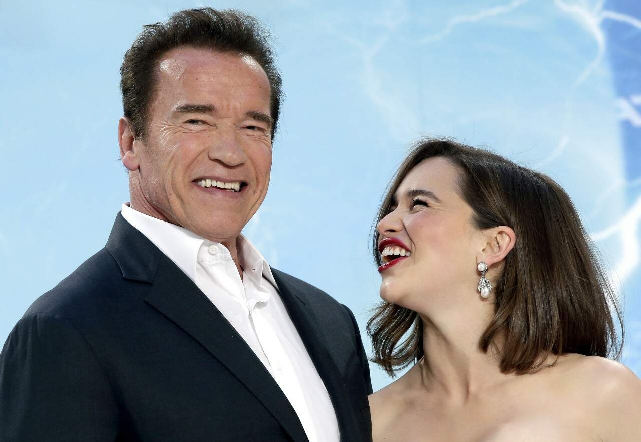 Arnold Schwarzenegger com Emilia Clarke (foto: Michael Sohn/AP)