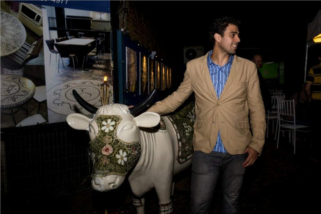 O artista Leonardo Posenato com os mosaicos da escultura que integrou a Cow Parade (Foto: Pedro Antonio Heinrich/especial)