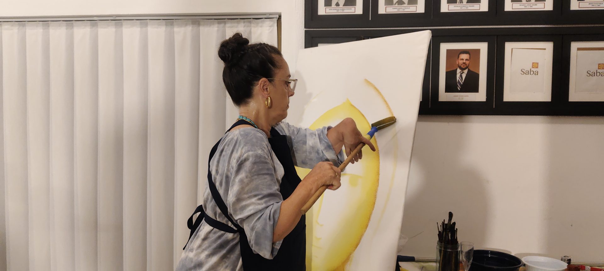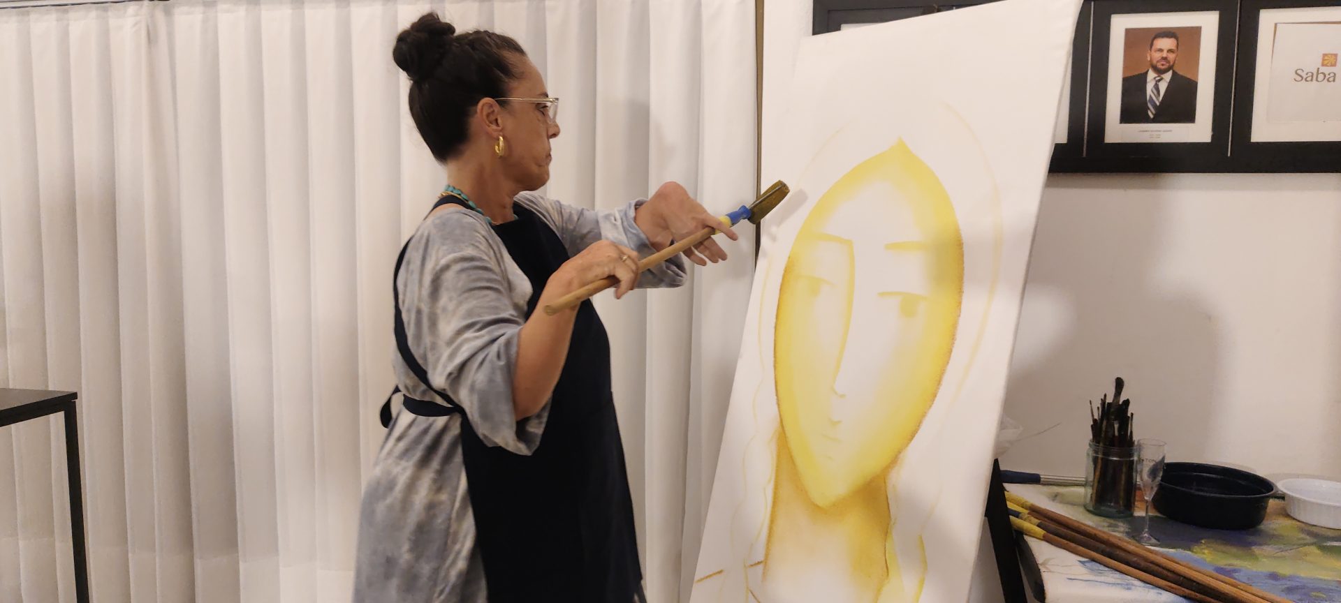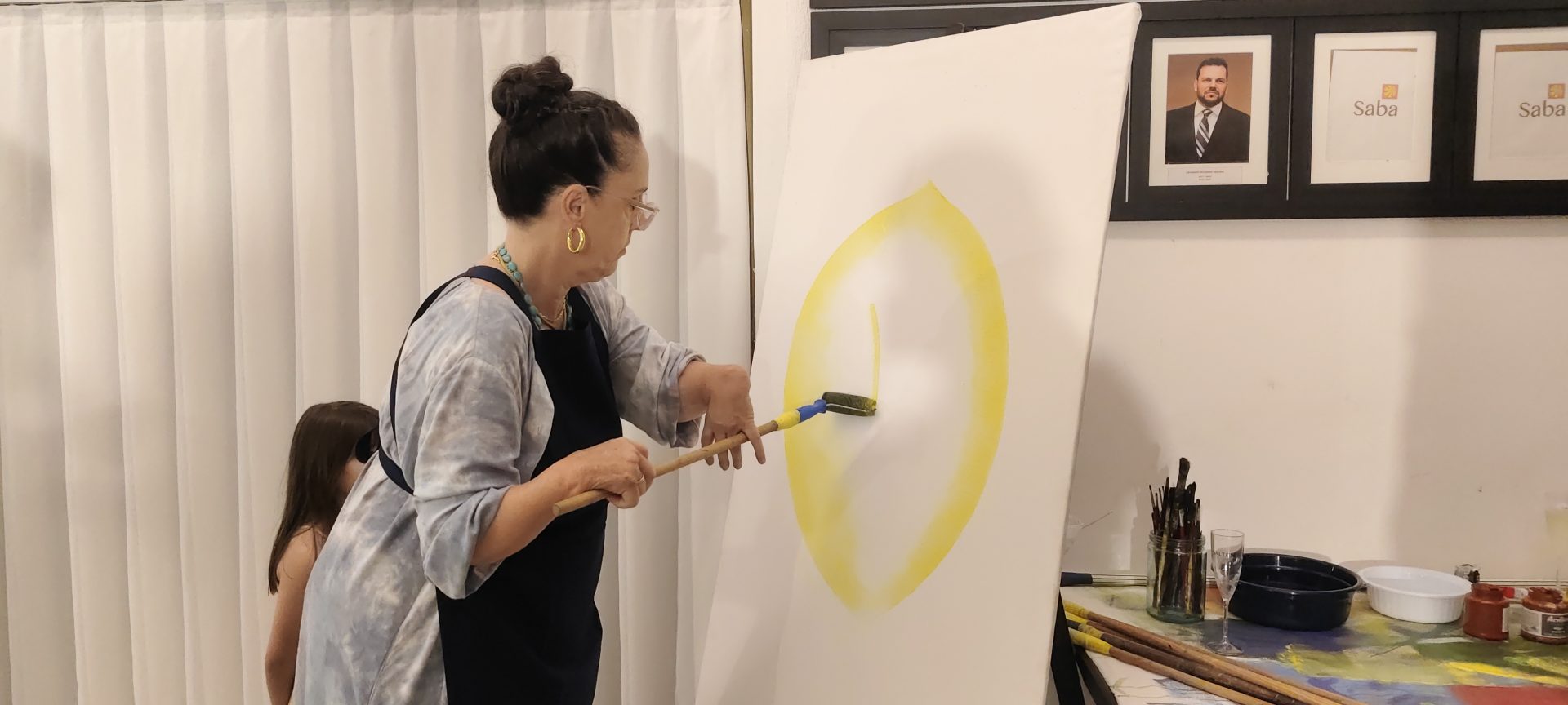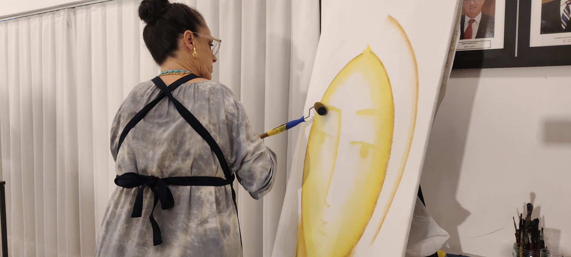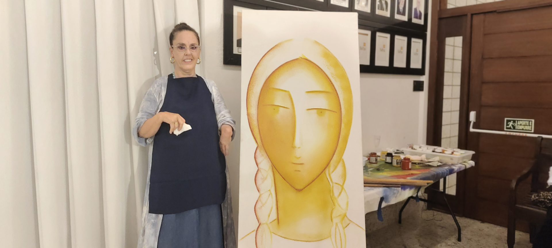 A exposição da artista plástica e escultora Tina Felice na Sociedade Amigos do Balneário Atlântida (SABA) foi marcada não apenas pelo impacto estético de suas obras em acrílico sobre tela, mas também pela demonstração ao vivo de sua técnica singular. Diante do público, Tina mostrou como concebe suas criações e como utiliza o pincel de rolo para alcançar resultados surpreendentes, mesmo enfrentando as limitações físicas decorrentes da talidomida.