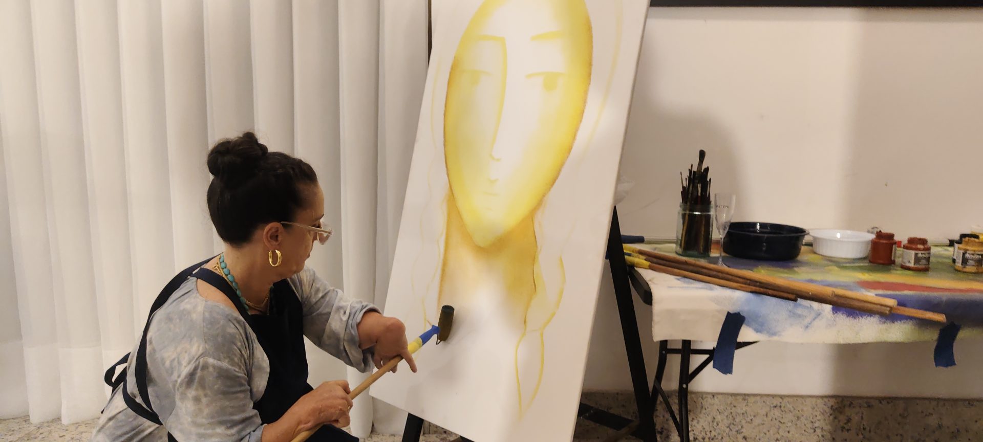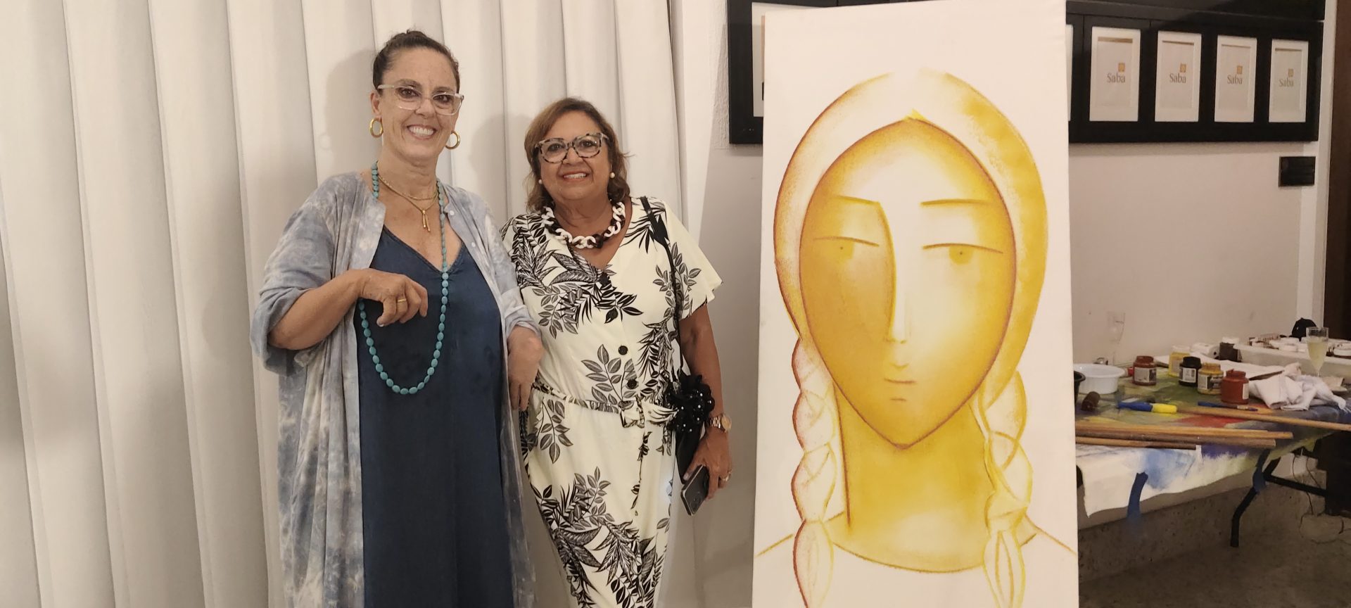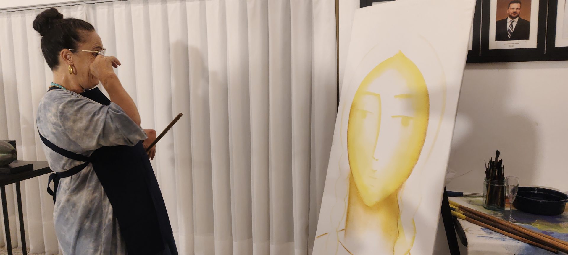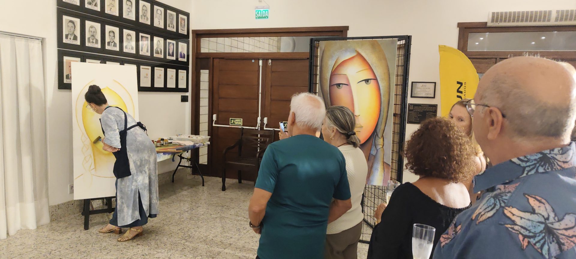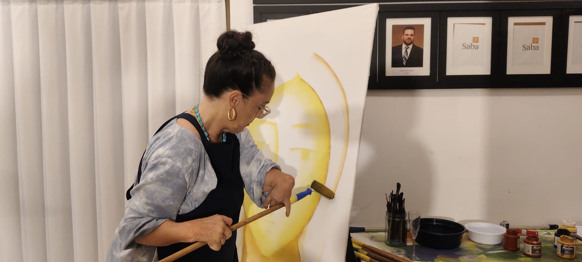 A exposição da artista plástica e escultora Tina Felice na Sociedade Amigos do Balneário Atlântida (SABA) foi marcada não apenas pelo impacto estético de suas obras em acrílico sobre tela, mas também pela demonstração ao vivo de sua técnica singular. Diante do público, Tina mostrou como concebe suas criações e como utiliza o pincel de rolo para alcançar resultados surpreendentes, mesmo enfrentando as limitações físicas decorrentes da talidomida.