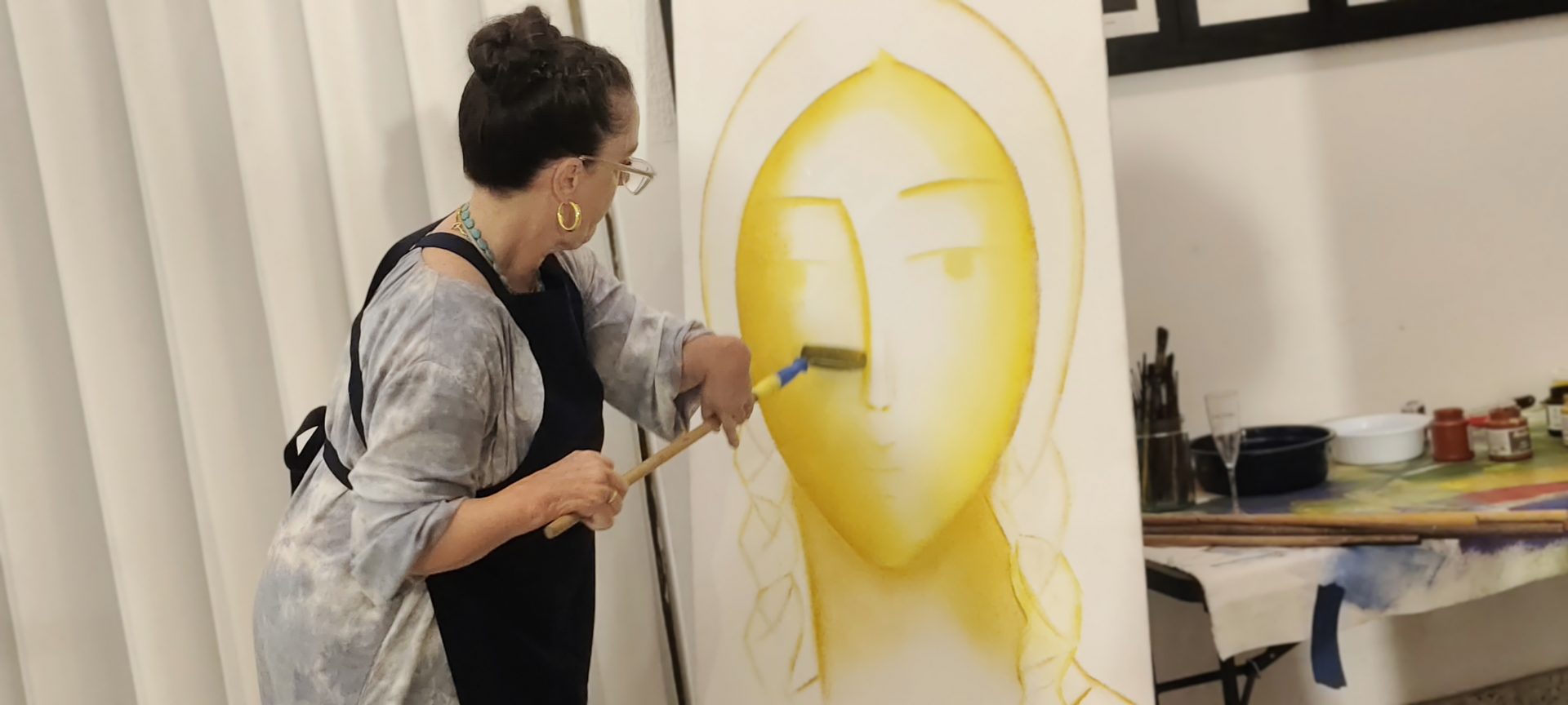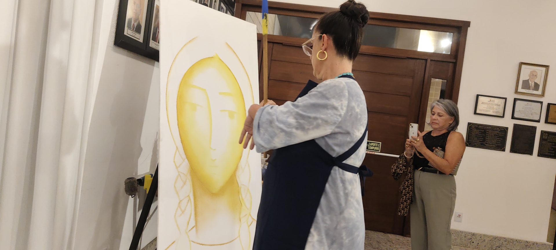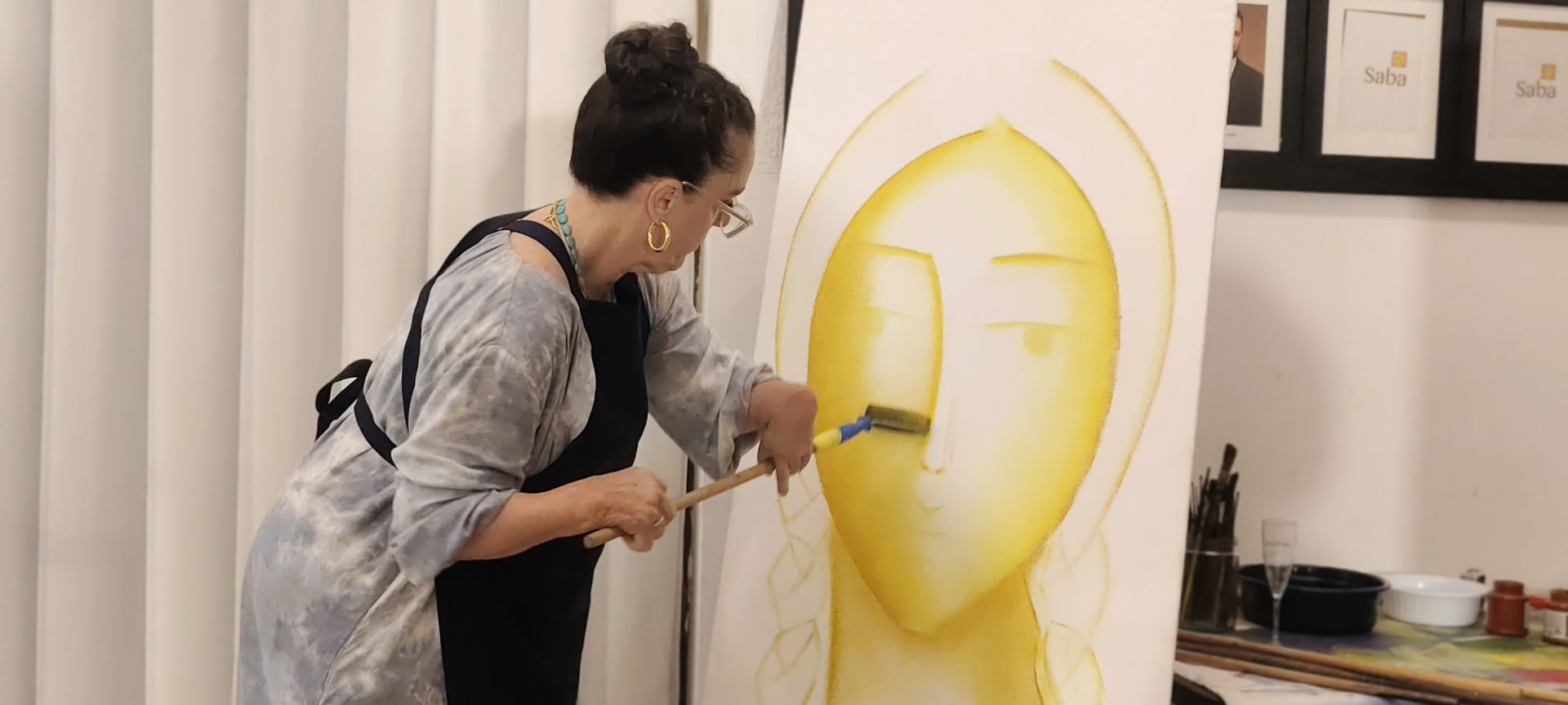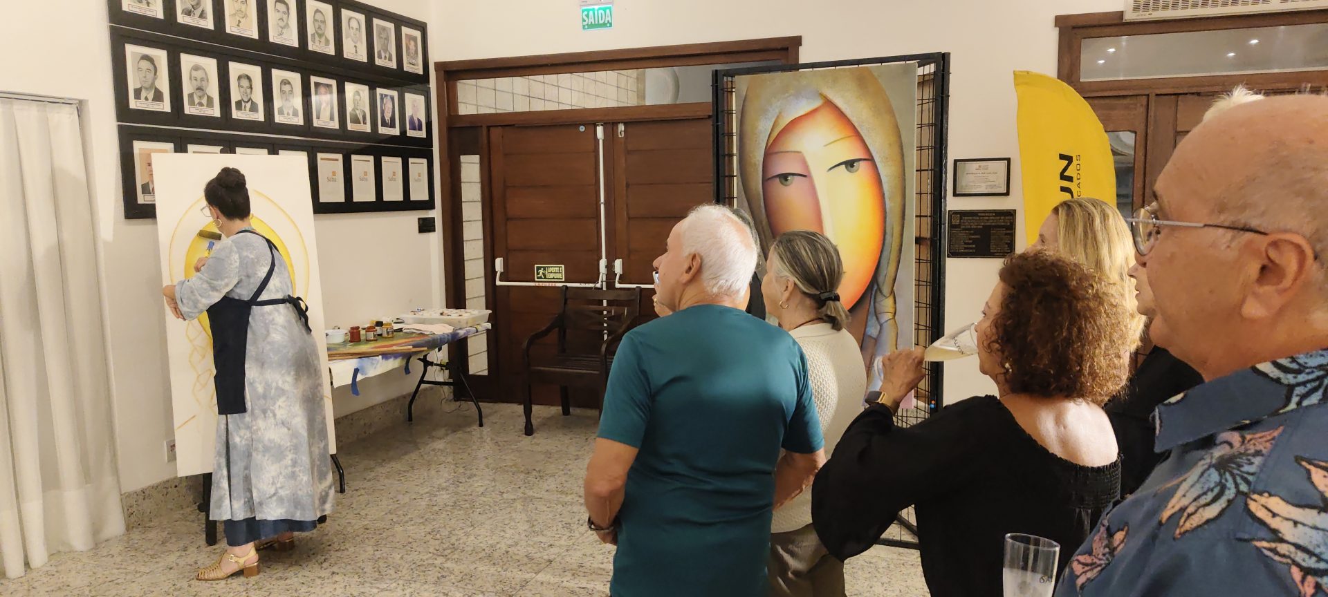 A exposição da artista plástica e escultora Tina Felice na Sociedade Amigos do Balneário Atlântida (SABA) foi marcada não apenas pelo impacto estético de suas obras em acrílico sobre tela, mas também pela demonstração ao vivo de sua técnica singular. Diante do público, Tina mostrou como concebe suas criações e como utiliza o pincel de rolo para alcançar resultados surpreendentes, mesmo enfrentando as limitações físicas decorrentes da talidomida.
