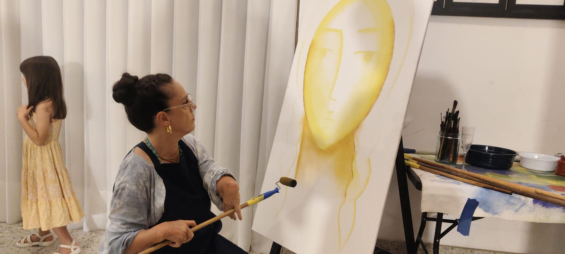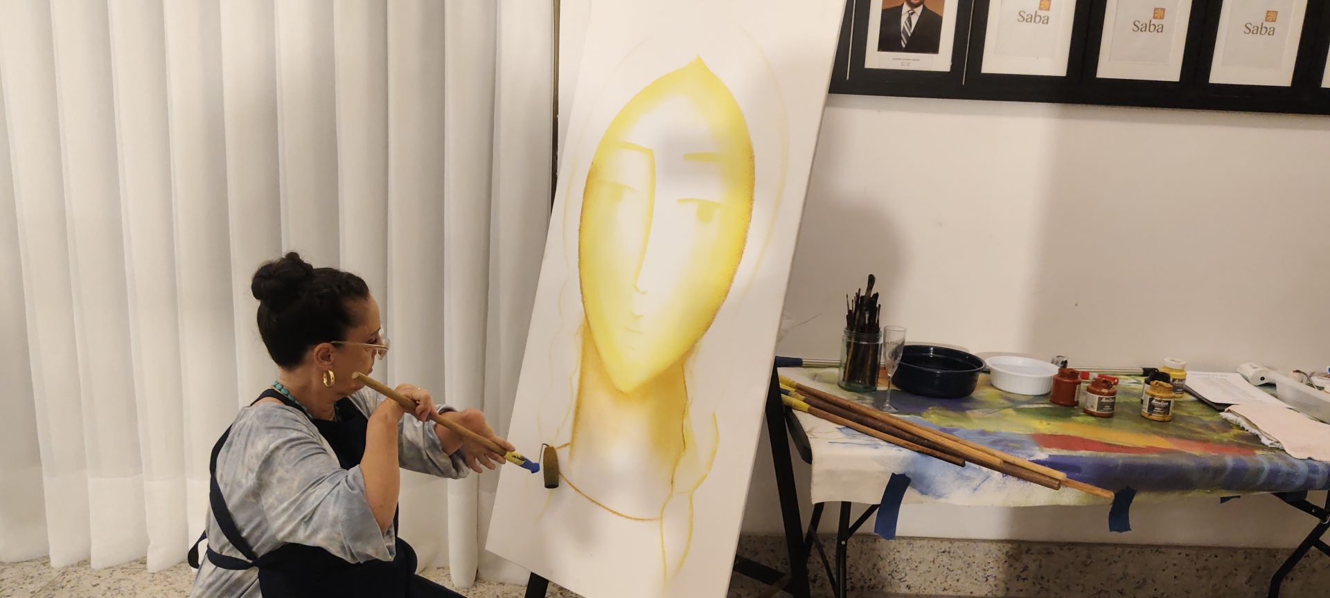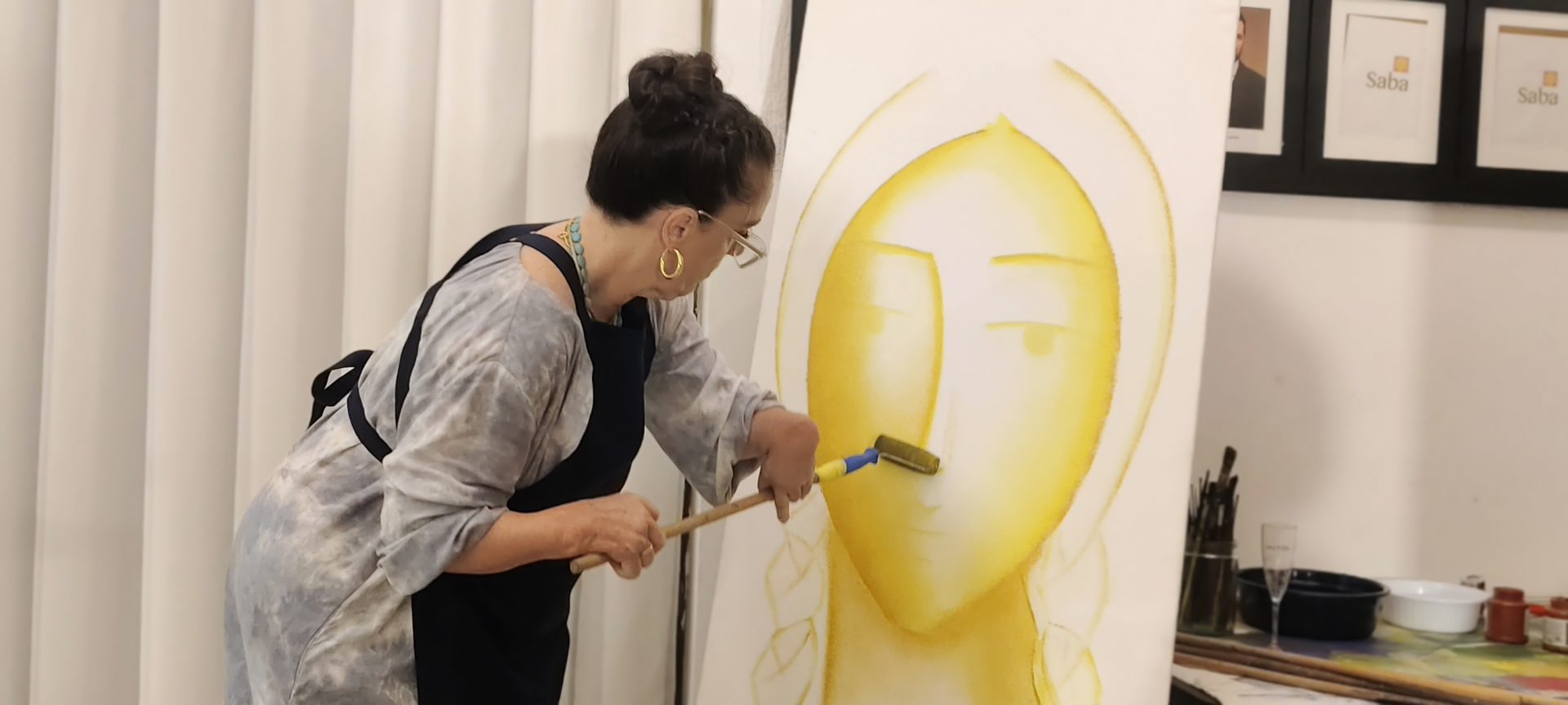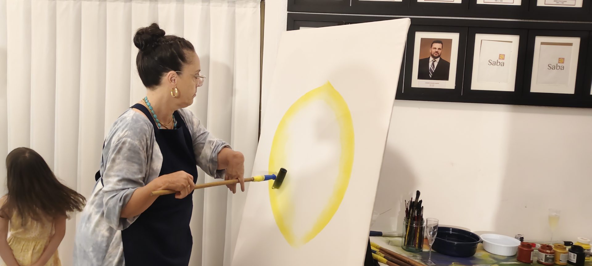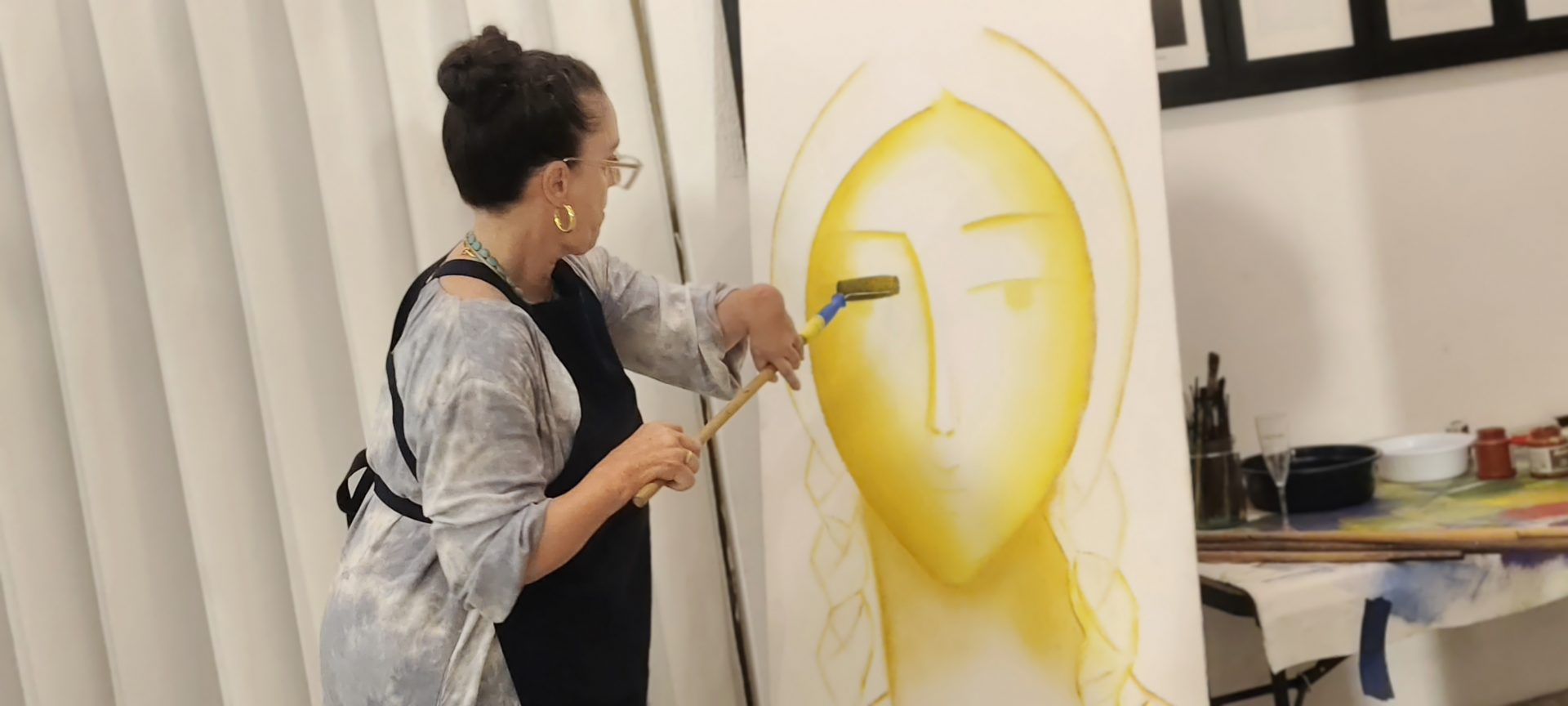 A exposição da artista plástica e escultora Tina Felice na Sociedade Amigos do Balneário Atlântida (SABA) foi marcada não apenas pelo impacto estético de suas obras em acrílico sobre tela, mas também pela demonstração ao vivo de sua técnica singular. Diante do público, Tina mostrou como concebe suas criações e como utiliza o pincel de rolo para alcançar resultados surpreendentes, mesmo enfrentando as limitações físicas decorrentes da talidomida.