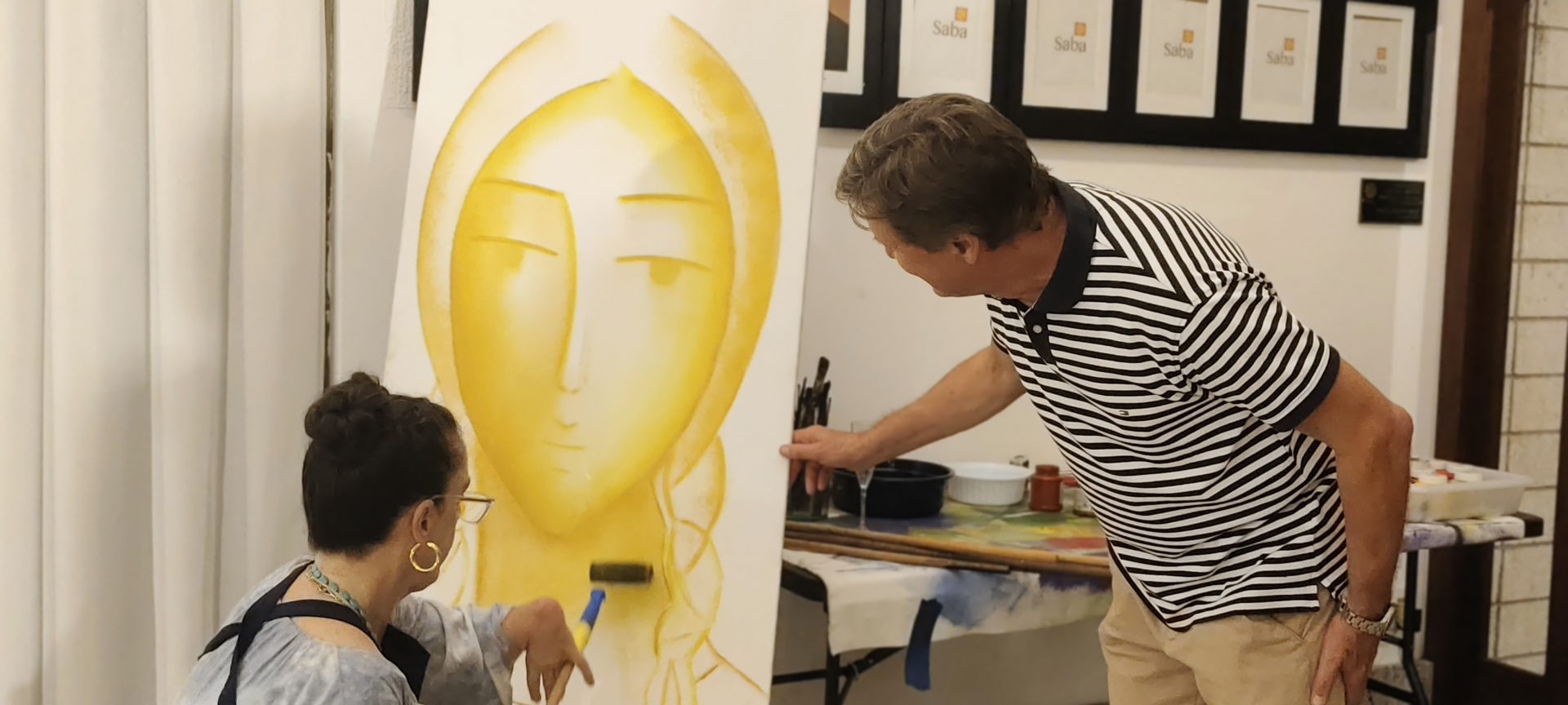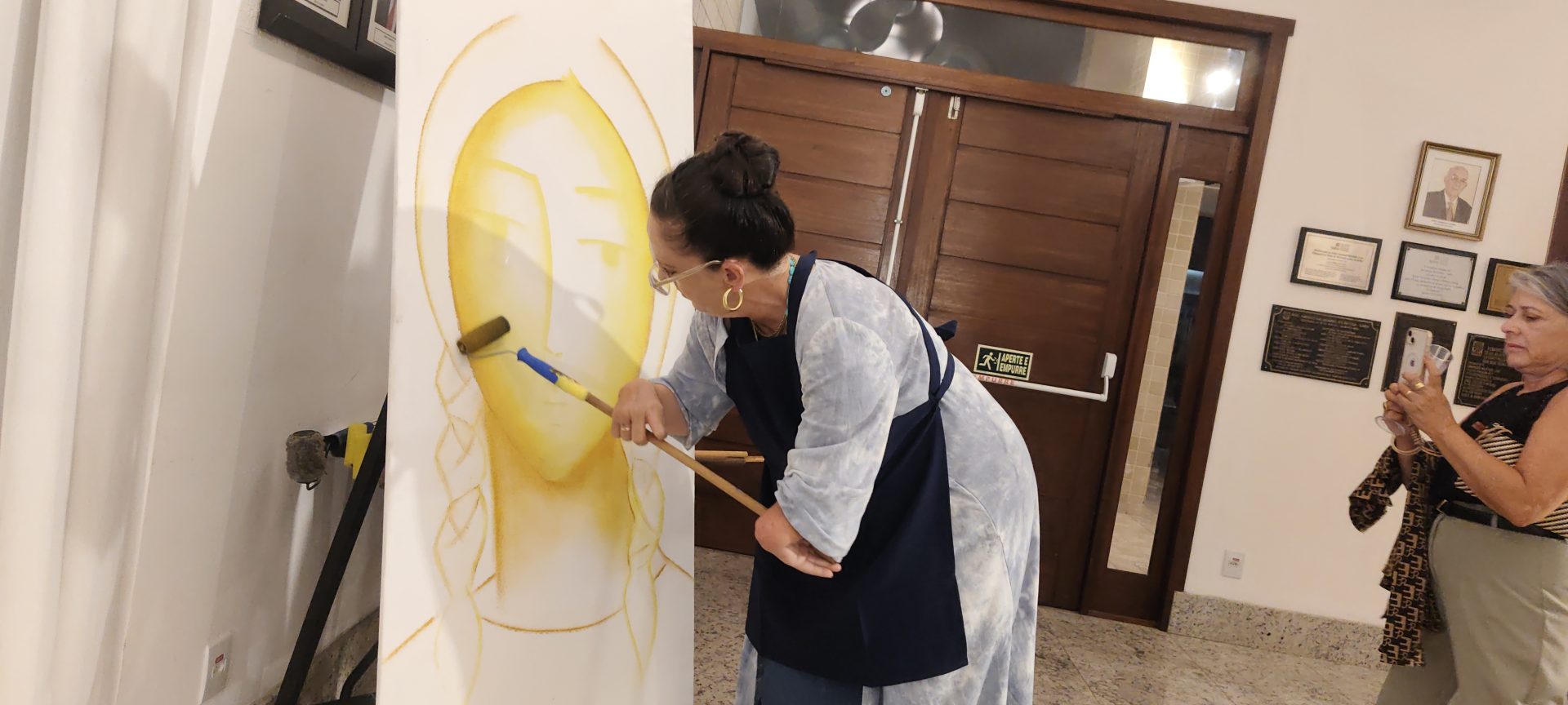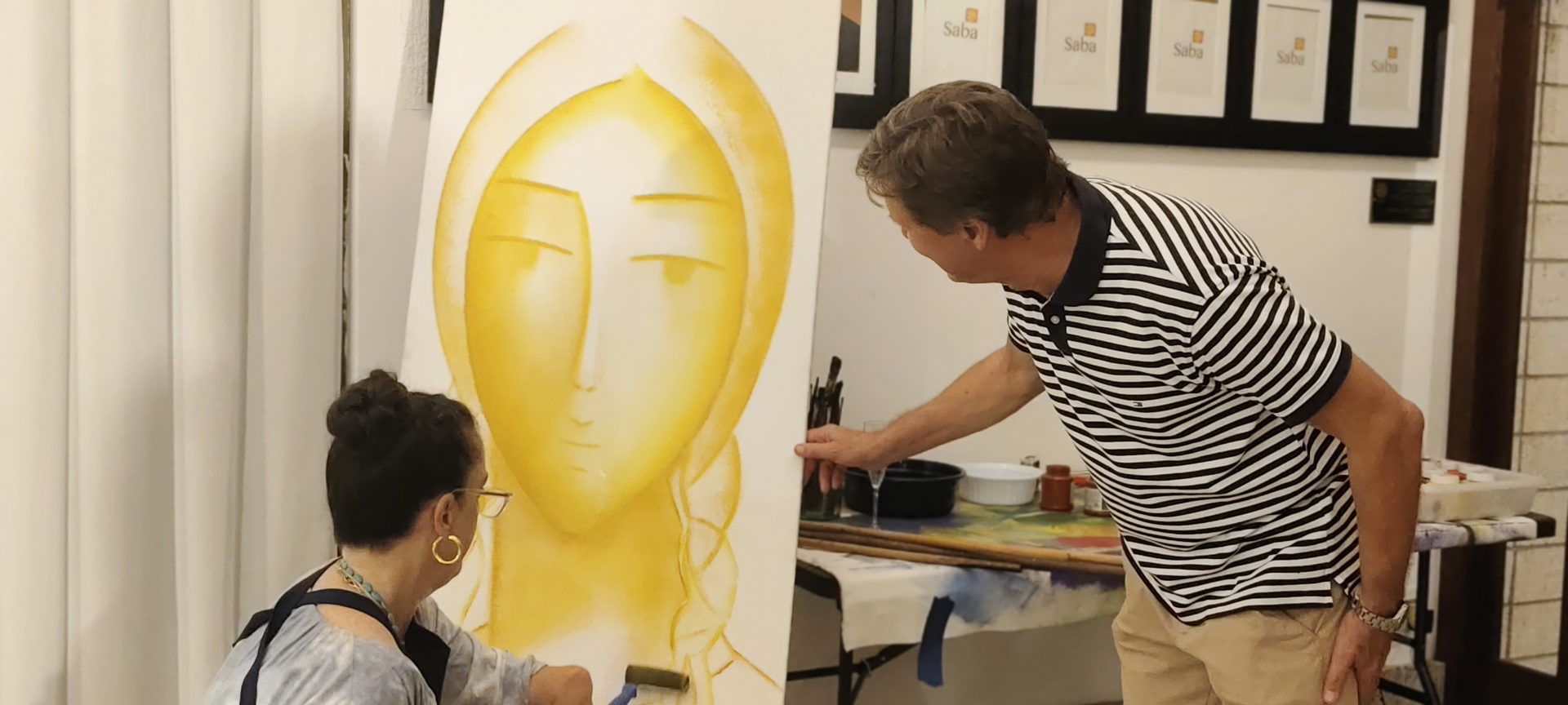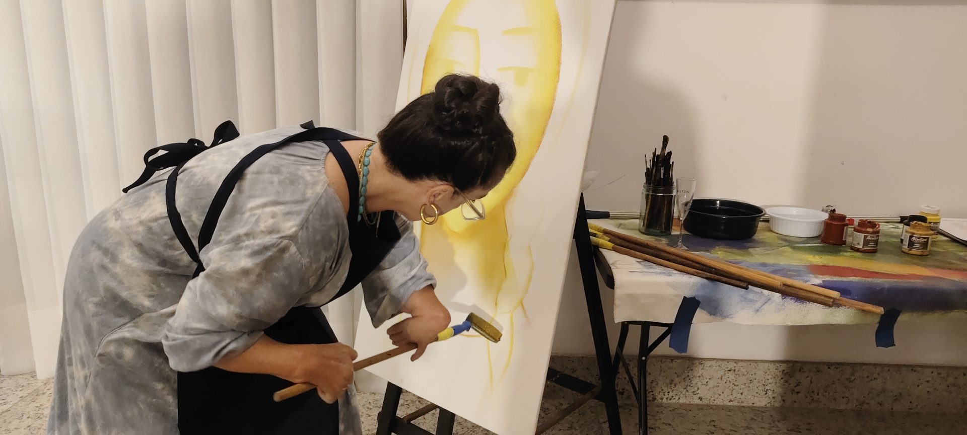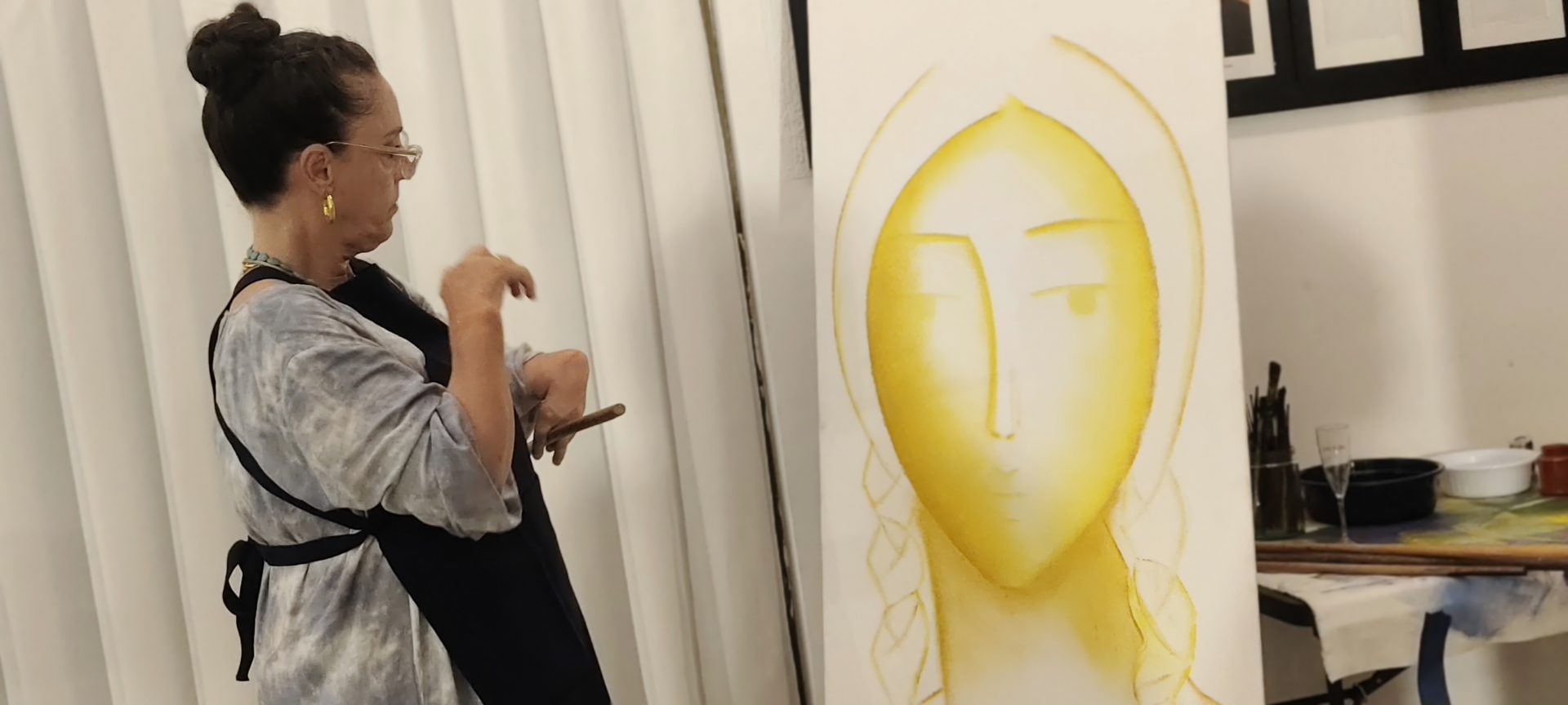 A exposição da artista plástica e escultora Tina Felice na Sociedade Amigos do Balneário Atlântida (SABA) foi marcada não apenas pelo impacto estético de suas obras em acrílico sobre tela, mas também pela demonstração ao vivo de sua técnica singular. Diante do público, Tina mostrou como concebe suas criações e como utiliza o pincel de rolo para alcançar resultados surpreendentes, mesmo enfrentando as limitações físicas decorrentes da talidomida.