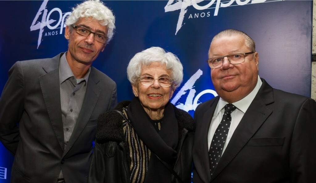 Eva Sopher entre Steffen Dauelsberg e Geraldo Lopes nas comemorações dos 40 anos da Opus Promoções. (Foto: Pedro Antonio Heinrich/especial)