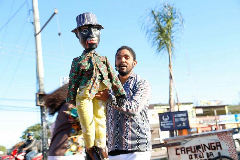 Luiz Filho, um dos responsáveis pela encenação e ventríloquo do espetáculo pernambucano que narra a história do mestre Cafuringa - camelô, palhaço e repentista -, empolgou o público que assistiu ao espetáculo na Esplanada da Restinga. (Foto: Lenara Petenuzzo/especial)