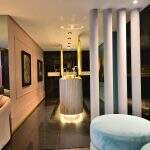 “Por exemplo, no Estar e Toalete Funcional foi idealizada uma ilha de mármore com duas cubas incrustadas. Foram utilizados painéis estofados revestidos em veludo. Para segmentar o ambiente de estar com o dos lavatórios, foi feita uma divisória de canos de pvc, revestida também pelo mesmo tecido. Um painel recortado a laser, que foi muito difundido nas divisões de ambientes, foi utilizado no forro, delimitando a área de aparador. Nas portas das cabines, ônix translúcidos possibilitam os frequentadores a perceberem se o banheiro encontra-se ocupado, através da luz, que quando acesa ilumina a pedra”, como aponta Mônica.
