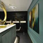 Os espelhos foram direcionados um para cada lado do ambiente, para que houvesse uma circulação em torno do elemento central que é a pia. Todos os acabamentos alinham a busca da funcionalidade com lançamentos e tendências (lançadas pelo Isaloni de Milão) combinados com elementos clássicos e materiais nobres que trazem o luxo do ambiente.
