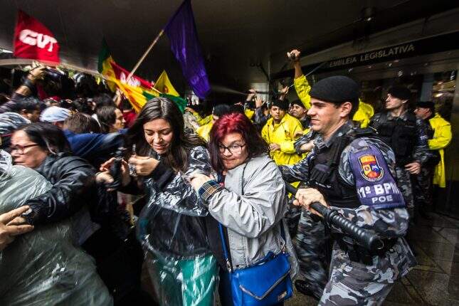 Porto Alegre – Servidores estaduais em greve, protestam na frente da Assembléia Legislativa contra pacote do Governador Sartori, tentam adentrar na casa. Polícia Militar, Brigada Militar, BOE investe contra manifestantes com cacetadas e gás lacrimogêneo . FOTO – Jackson Ciceri