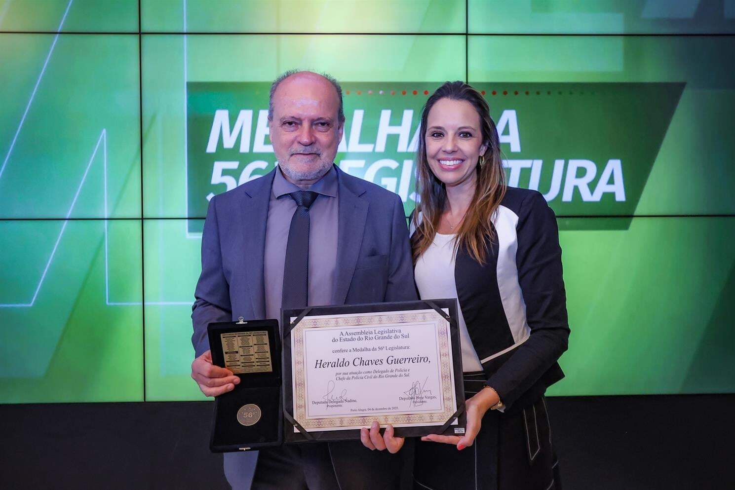 O Chefe da Polícia Civil do Rio Grande do Sul, delegado Heraldo Guerreiro, recebeu a Medalha da 56ª Legislatura da Assembleia Legislativa. A homenagem foi proposta pela deputada Delegada Nadine