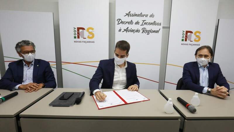 Foto: Itamar Aguiar/Palácio PiratiniPara incentivar o desenvolvimento regional, aproximando investidores, empresários e turistas, o governador Eduardo Leite assinou, nesta segunda-feira (14), decreto que prevê mudanças na política de incentivo à aviação no Rio Grande do Sul. De forma a reduzir os impactos causados pela pandemia no transporte aéreo, o Estado está reduzindo a base de cálculo do ICMS na aquisição de querosene para as companhias.