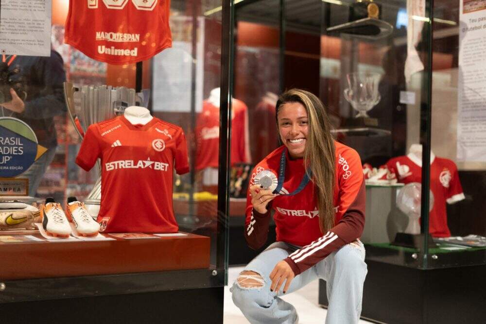 A atacante colorada Priscila celebrou, no Beira-Rio, a conquista da medalha de prata nos Jogos Olímpicos de Paris 2024 pela Seleção Brasileira de futebol feminino. Em evento realizado na tarde de terça-feira (20) no Museu do Inter, a atleta das Gurias Coloradas recebeu homenagens da gerente de futebol feminino, Luiza Parreiras, e do vice-presidente de futebol, José Olavo Bisol. Com 19 anos, Priscila Flor da Silva também recebeu uma placa das mãos do ex-jogador e também medalhista olímpico, Pinga, simbolizando o feito.