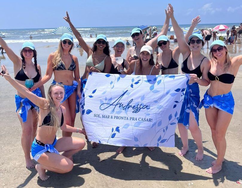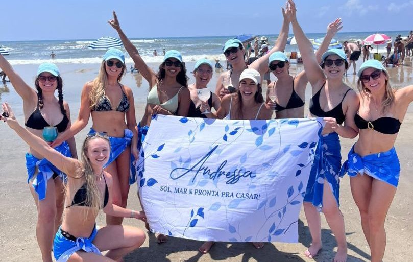 Na areia de Atlântida, em Xangri-lá, a noiva Andressa Drösee foi celebrada em sua despedida de solteira: cercada por madrinhas em trajes iguais e faixas, num cortejo divertido que virou atração do veraneio.