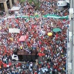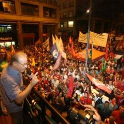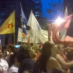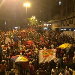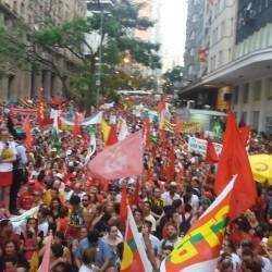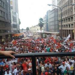 Manifestantes favoráveis ao governo Dilma Rousseff fazem caminhada pela avenida Borges de Medeiros na noite desta sexta-feira. O grupo se concentrou na Esquina Democrática, área Central de Porto Alegre. O Comando de Policiamento da Capital informou que a área conta com reforço de efetivo na região atendida pelo 9º BPM (Batalhão de Polícia Militar).